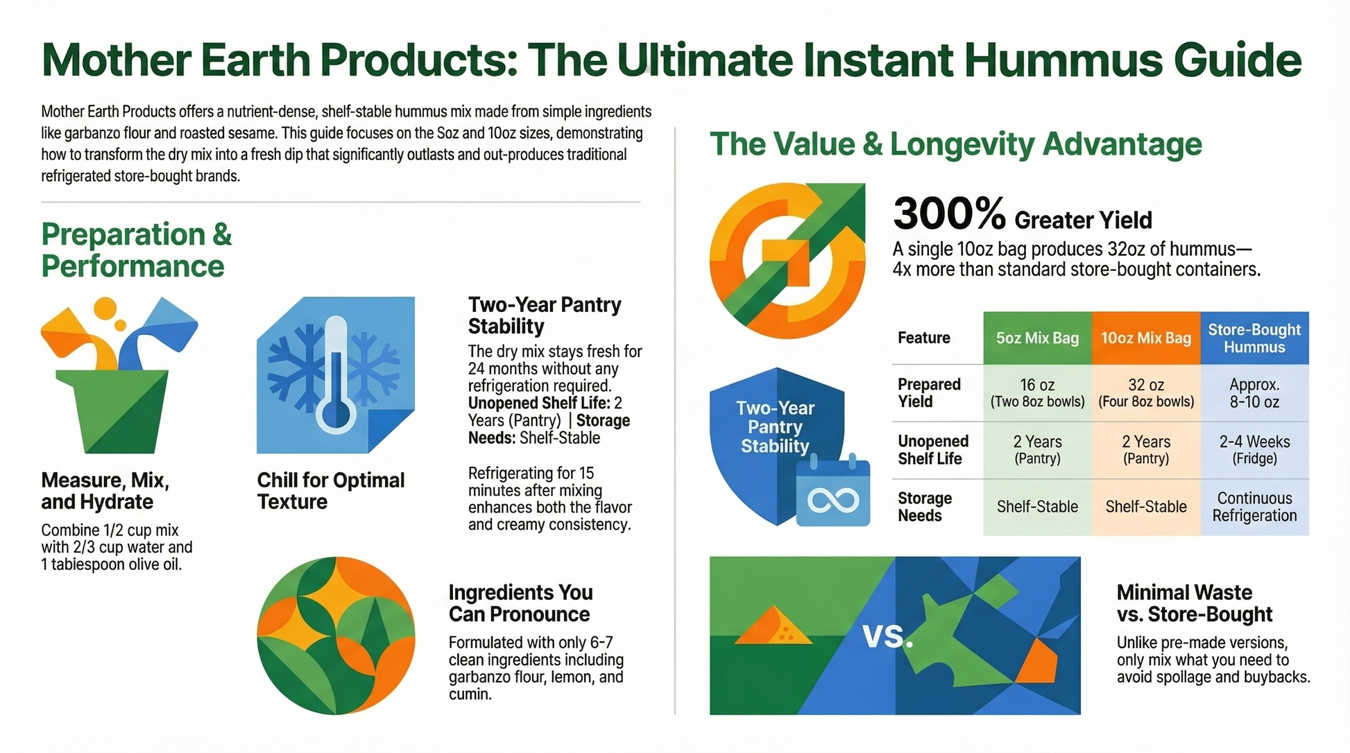 Introducing the Mother Earth Products Instant Classic Hummus Mix in a new, convenient 5 oz resealable bag—perfect for those seeking a quick, nutritious snack or a delightful addition to meals.Crafted from wholesome, pronounceable ingredients, this mix delivers the bold, tangy flavor of traditional hummus with a hint of lemon, ready in minutes.