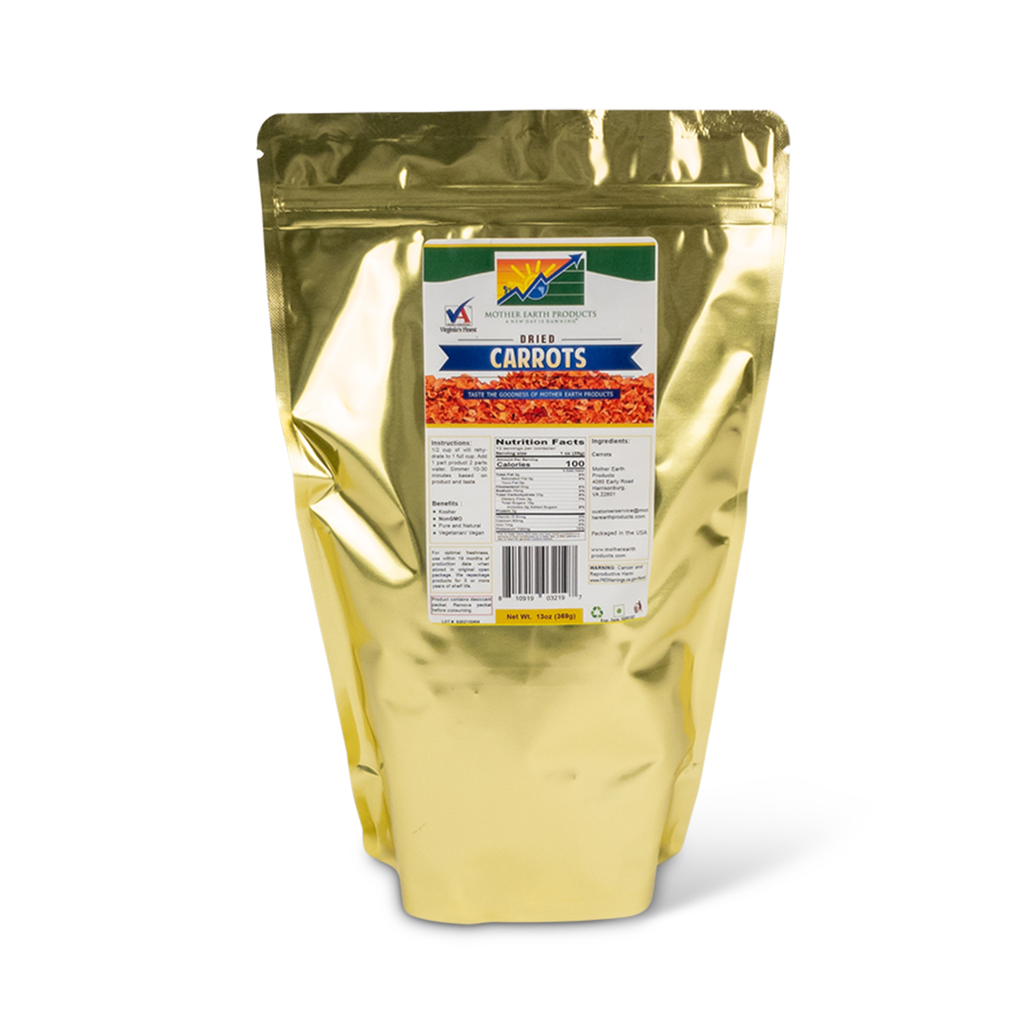 Our Dried Carrots offer a delightful crunch, a sweet taste, and a host of health benefits. Proudly grown and dried by US-based companies, our carrots are Non-GMO and free of preservatives or additives. Our Dried Carrots maintain up to 90% of their original nutritional value, making them a fabulous addition to salads, soups, any dish, or as a quick snack for busy individuals of all ages. They are Kosher and hand-packaged with the utmost care to ensure the highest quality, care, and freshness.