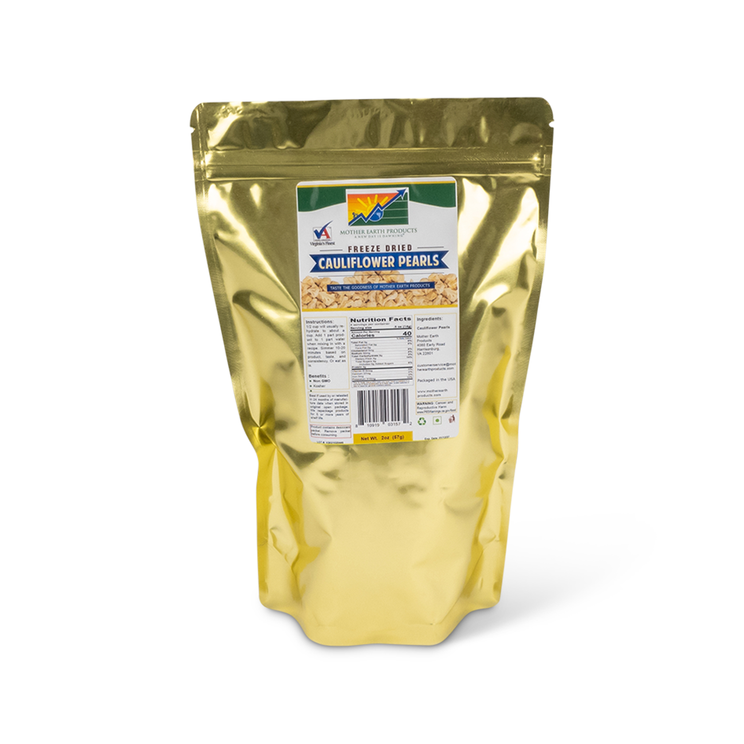 Our freeze dried cauliflower pearls are high quality, freeze dried by reputable food manufacturers around the USA. They are also kosher, and packaged carefully by hand for optimum quality, care, and freshness.
